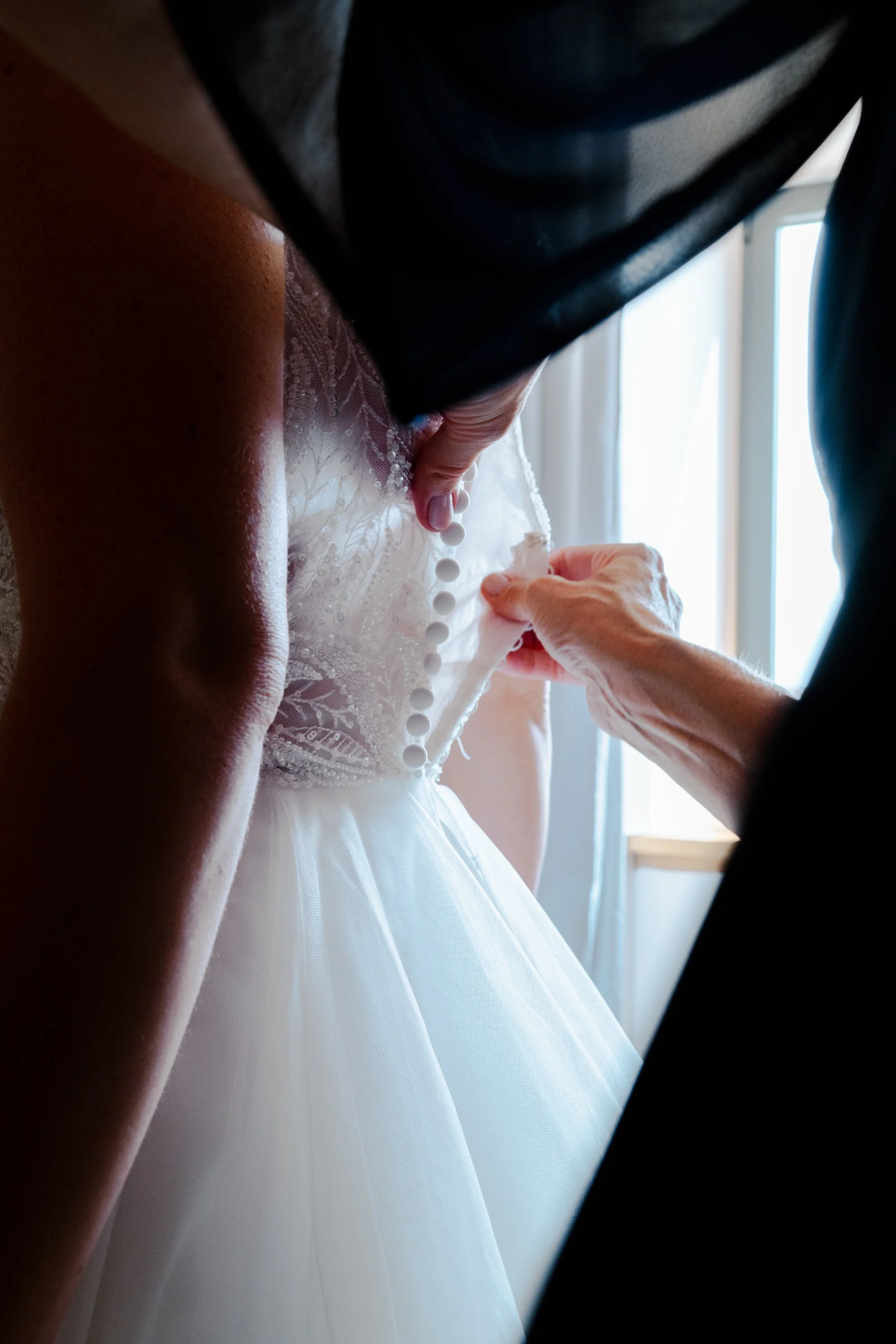 Une personne aide une femme à boutonner sa robe de mariage blanche près d'une fenêtre